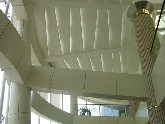 铝单板幕墙表面一般经过铬化等前处理后,再采用氟碳喷涂处理。氟碳涂料面漆和清漆的聚偏氟乙烯树脂(KANAR500)。一般分为二涂、三涂或四涂。氟碳涂层具有好的抗腐蚀性和耐候性,能抗酸雨、盐雾和各种空气污染物,耐冷热性能好,能抵御强烈紫外线的照射,能长期保持不褪色、不粉化,使用寿命长。